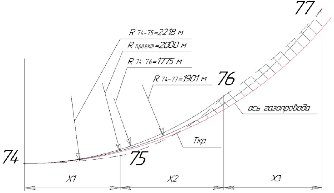 Как следует из рис. 5, точки позиционирования скважины, находящиеся на окружности с радиусом 2000 м и ниже неё, отвечают условию упругого изгиба трубопровода (как следствие, условию вписываемости трубопровода в скважину), ), а точки, находящиеся выше, не отвечают данному требованию . Так, точка «75» находится ниже проектного положения, а точки «76» и «77» – выше. На участке «74–77» пунктирной линией показано фактическое положение оси изогнутого участка скважины относительно проектной оси – оси трубопровода, выделенного красной линией. Оси трубопровода и участка скважины пересекаются в некоторой точке . Заштрихованный участок теоретически соответствует зоне, на которой трубопровод не вписывается в скважину.