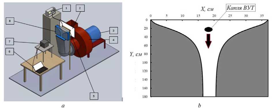 Рис. 1. Экспериментальный стенд (a) и схема движения капли ВУТ в сопловом аппарате (b): 1 – инфузионный шприцевой насос Mindray BeneFusion SP3; 2 – источник света; 3 – электродвигатель АДМ80И2У3; 4 – центробежный вентилятор ВЦ5; 5 – держатель со шприцом; 6 – персональный компьютер; 7 – высокоскоростная камера Evercam 1000-32М; 8 – сопло Витошинского (ось X, Y – горизонтальная и вертикальная оси)