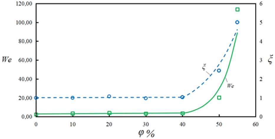 На рис. 5 приведены зависимости критического числа Вебера (We) и относительной скорости капли в момент разрушения (ξ=|Vg-Vd |⁄ ; где Vg, Vd – скорости воздуха и капли в зоне ее разрушения, – скорость воздуха на входе в сопловой аппарат, =7 м/с) от концентрации угольной компоненты в топливе. Можно отметить, что зависимости We(φ) и имеют характер типа «хоккейная клюшка». Последнее обусловлено тем, что, как уже указывалось выше, при переходе через значения φ≥50 % скачкообразно меняются характеристики дробления капель ВУТ. Данный эффект обусловлен тем, что в этих условиях частицы угля в суспензии начинают играть роль связующего материала, что приводит к существенному росту сил вязкости и сил поверхностного натяжения и к соответствующему изменению диспергирования капли.