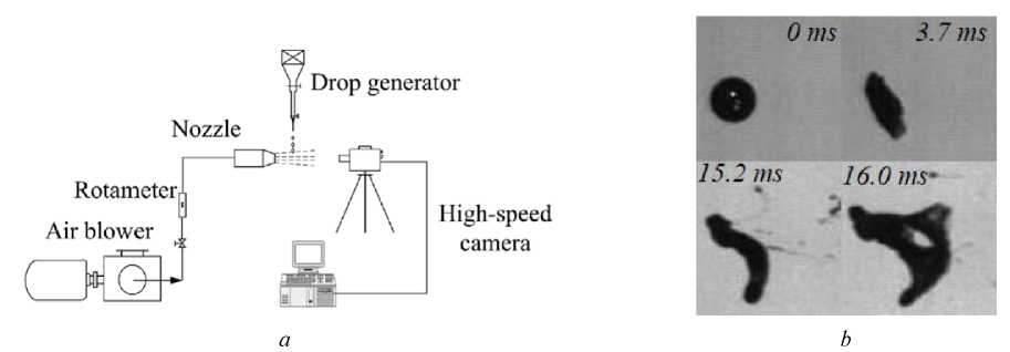 Рис. 6. Схема экспериментального стенда (а) и типичные кадры процесса дробления одиночных капель ВУТ (b), приведенные в [24, 27, 40]