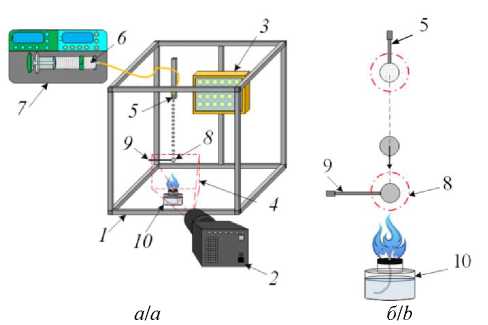 Рис. 1. Экспериментальный стенд (а) и схема проведения эксперимента (б): 1 – каркас стенда; 2 – высокоскоростная видеокамера; 3 – прожектор; 4 – область регистрации; 5 – сменные сопла различного диаметра; 6 – шприц с жидкостью; 7 – шприцевой насос; 8 – закрепленная капля суспензии; 9 – держатель капли; 10 – спиртовая горелка