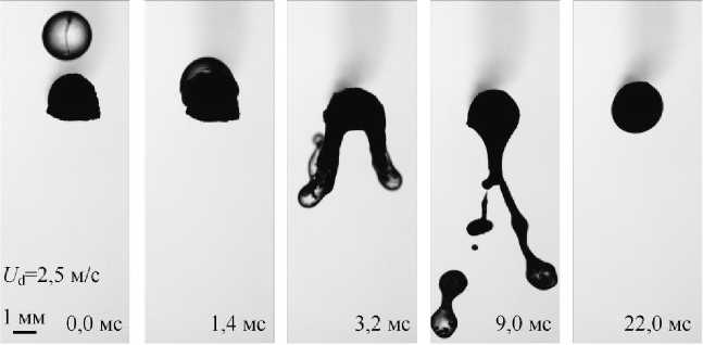 На рис. 2–4 приведены видеокадры соударения движущейся капли-снаряда с каплей-мишенью, закрепленной на держателе и находящейся в газовоздушной среде с температурой 90 °С.