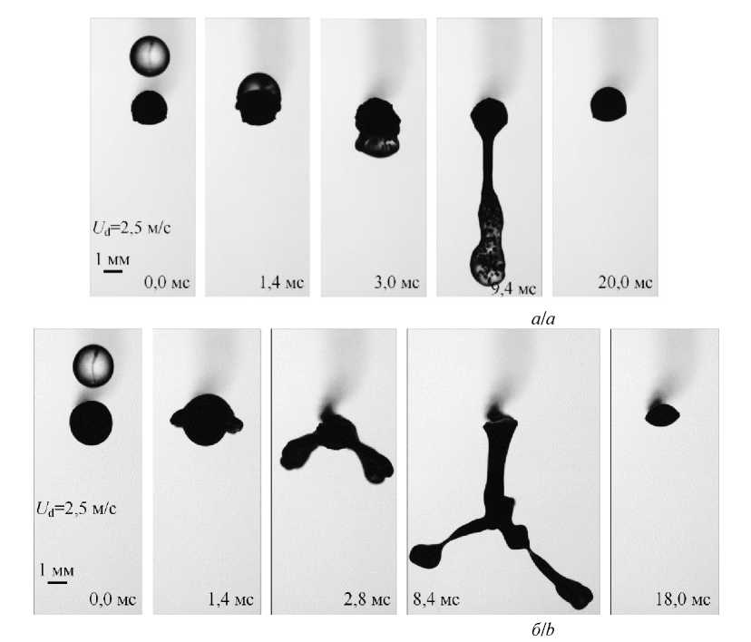 Рис. 3. Видеокадры соударения капли-снаряда Сp1=10 мас. %, Rd1=1,25 мм с закрепленной на держателе каплей-мишенью Сp2=60 мас. %, Rd2=1,25 мм, находящейся в газовоздушной среде с температурой 90 °С в течение времени t=10 с: а) капля-снаряд № 1; б) капля-снаряд № 2