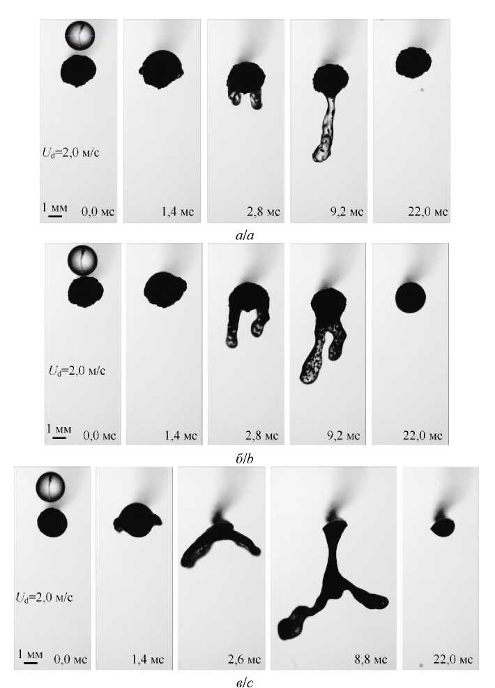 При этом на рис. 3, а видно, что капля-снаряд № 1 уносит с собой часть твердых частиц с поверхности капли-мишени. При сравнении геометрических размеров капли-мишени перед соударением с каплей-снарядом № 1 и оставшейся на держателе жидкости, видно, что капля-снаряд № 1 оставляет часть суспензии на поверхности капли-мишени. Это подтверждается изменением взаимодействия капли-снаряда № 2 и капли-мишени.