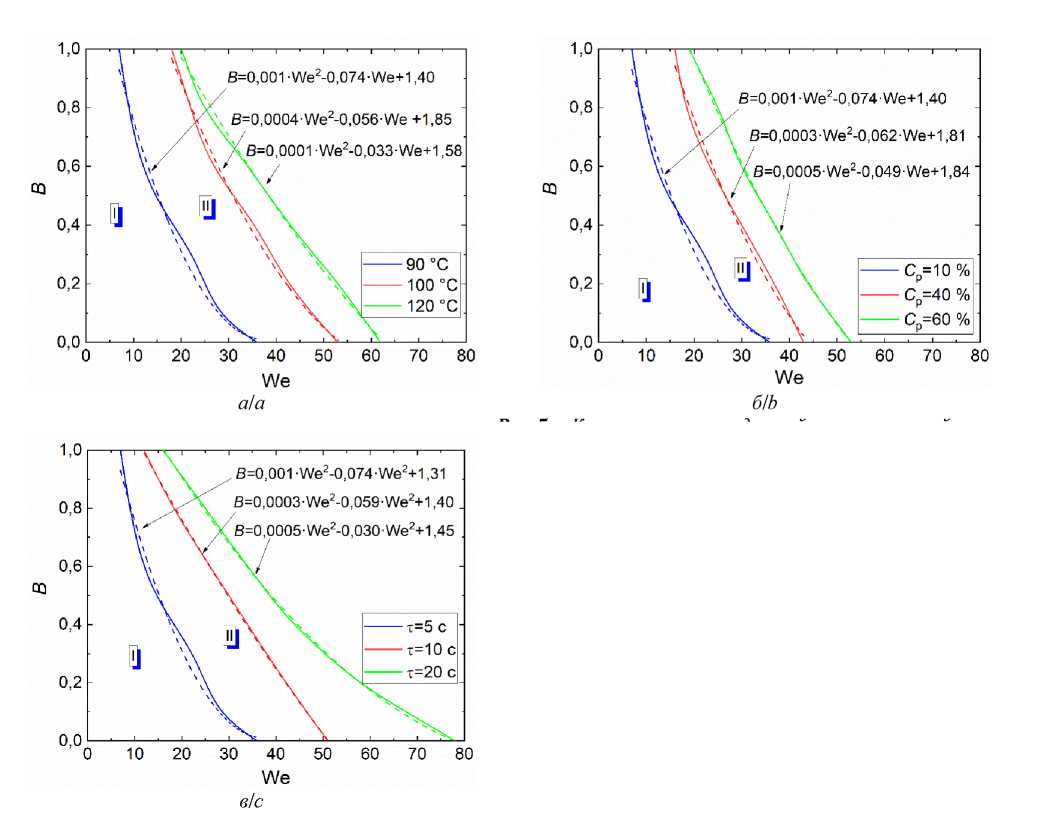 При обработке результатов, представленных на рис. 5, получены аппроксимационные выражения для границ режимов агломерации и дробления при варьировании температуры газовоздушной среды, концентрации твердых частиц в суспензии и времени нахождения капли в газовоздушной среде с повышенной температурой. В общем виде выражения имеют вид: