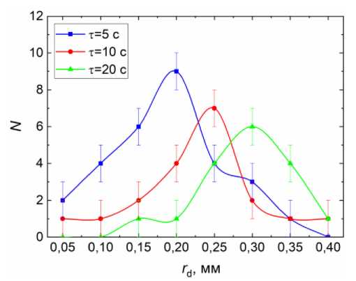 Рис. 6. Распределения по размерам вторичных фрагментов при соударениях капли-снаряда Rd1=1,25 мм, Сp1=10 мас. % и капли-мишени Rd2=1,25 мм, Сp2 = 60 мас. % при варьировании времени ее нахождения в газовоздушной среде с температурой 90 °С
