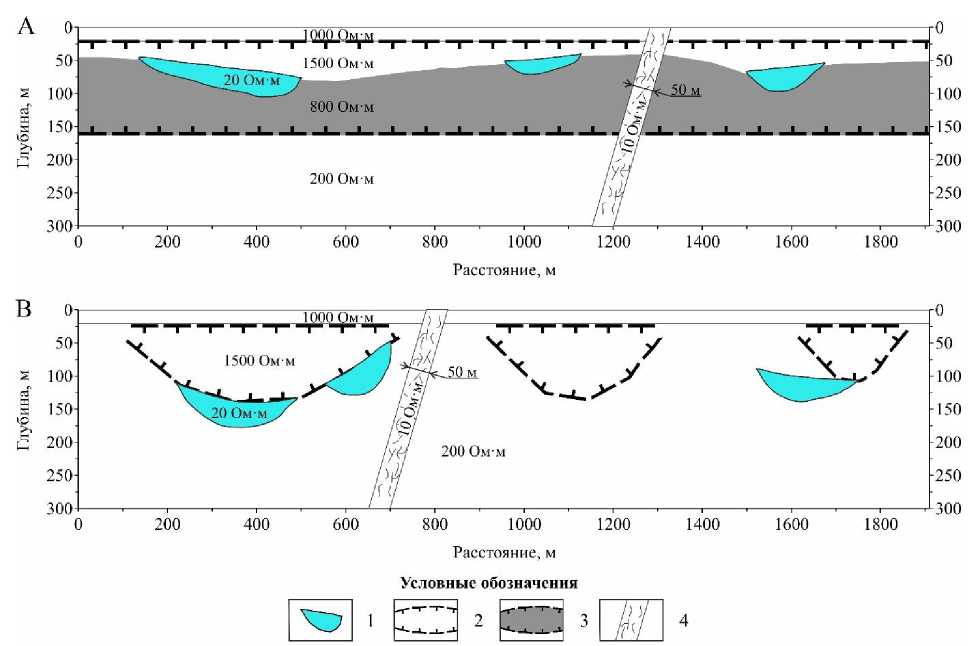 Рис. 2. Геоэлектрические модели со сплошной мерзлотой (А) и с прерывистой мерзлотой (B): 1 – таликовая зона; 2 – высокотемпературные ММП; 3 – низкотемпературные ММП; 4 – разломная зона