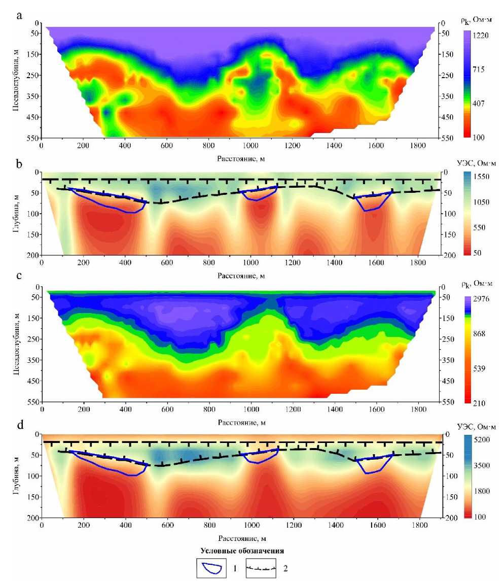 Рис. 3. Результаты решения прямой и обратной задачи электроразведки для трехэлектродной установки с шагом 10 м и варианта значений сопротивления № 1 (а и b соответственно), варианта № 2 (c и d соответственно) для модели А: 1 – контур таликовых зон; 2 – зона ММП