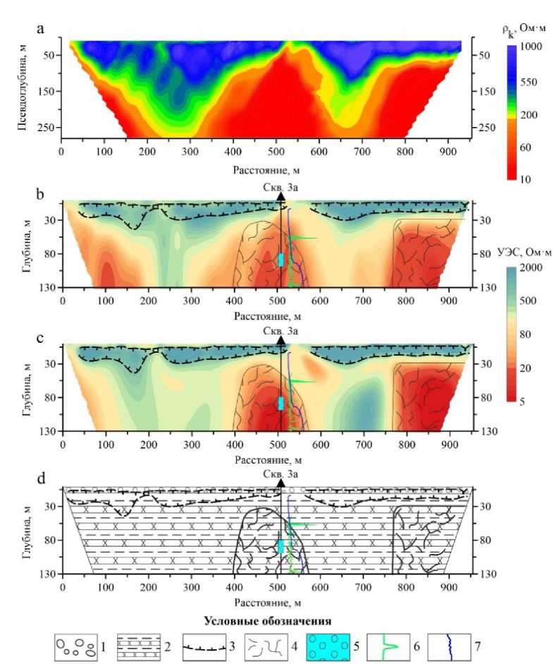 На рис. 6 представлены: разрез кажущегося сопротивления (рис. 6, а), полученный по результатам съёмки методом электротомографии; разрезы по УЭС, полученные в результате решения одномерной (рис. 6, b) и двумерной (рис. 6, c) обратных задач электроразведки; схематический геологический разрез, построенный по данным бурения (рис. 6, d), по одному из профилей на участке работ.