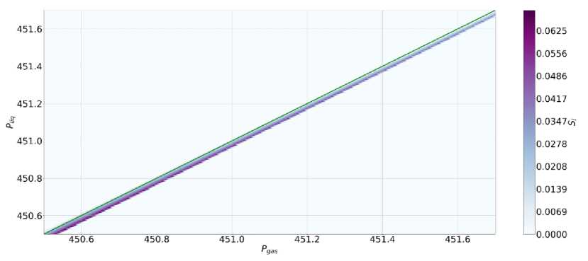 Был произведен расчет фазового равновесия в окрестности точки росы для различных ГП H и для различных значений Pg и Pl КНГКМ. Получены ТКК, которые описываются уравнением (13). Для значения H=4000 м была обнаружена двухфазная область при давлениях Pg>Pdew. Согласно [7] граница двухфазной области в окрестности точки росы аппроксимируется прямой (Pl–Pdew)=a(Pg–Pdew) с коэффициентом наклона a, где Pdew – давление точки росы. Для H=4000 м значение коэффициента a=0,9228. Результаты расчета двухфазного равновесия для H=4000 м представлены на рис. 2 в виде фазовой диаграммы (ФД) в координатах (Pg,Pl).