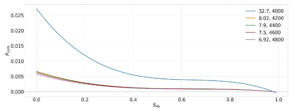 Fig. 1. Capillary curve for the considered Karachaganak oil and gas condensate field (KOGCF) mixture with f=12,2% and k=3,4×10–3 mm2