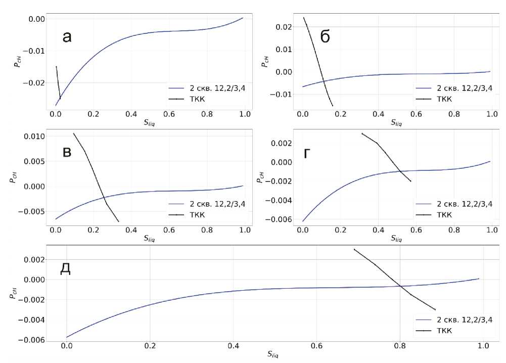 где pc(Sl) – экспериментальная капиллярная кривая (ЭКК), полученная одним из методов, описанных в [16]. Решением уравнения (14) являются точки пересечения ТКК и ЭКК. Взаимные положения и количество точек пересечения обоих видов капиллярных кривых (КК) зависит от типа пористой среды. В случаях смачиваемой и несмачиваемой пористых сред КК имеют как минимум одну общую точку, а в случае смешанной смачиваемости имеют как минимум две точки пересечения.