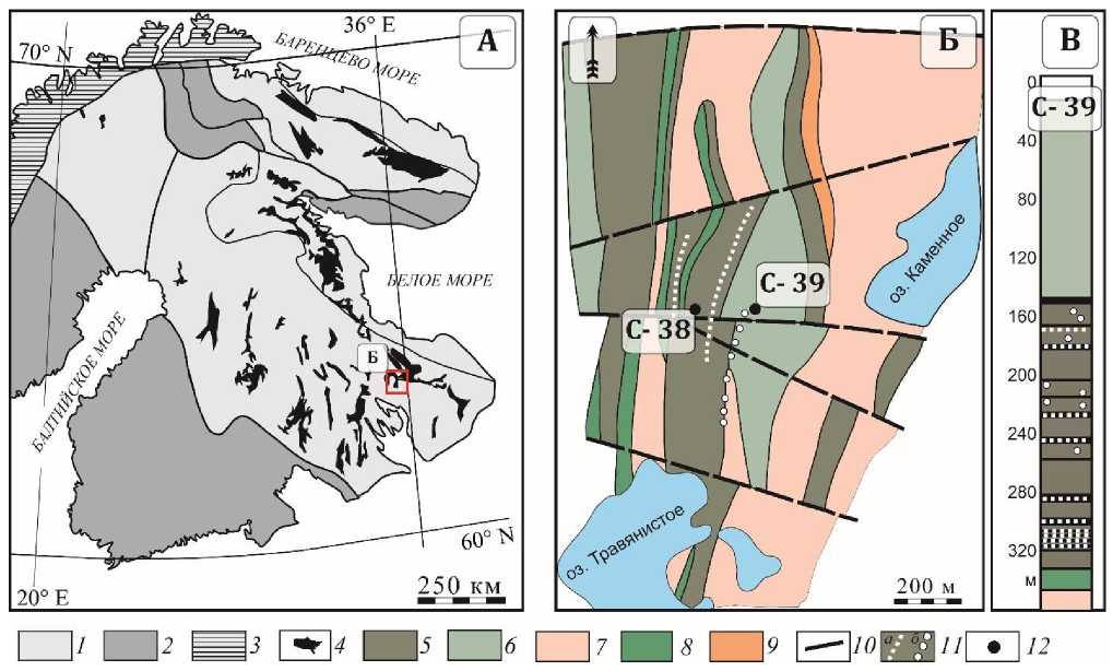 Fig. 1. Geological sketch of the Fennoscandinavian Shield (a) and the Central Vozhma zone of the Kamennoozerskaya formation (b) according to [11, 12], with modifications. A: 1 – Archean crust; 2 – Paleoproterozoic crust; 3 – Caledonides, Baikalides and Neoproterozoic formations; 4 – Archean greenstone and Paragneissic belts. Б: 5 – volcanogenic-sedimentary strata of intermediate rocks, 6 – metabasalts, 7 – serpentinites after peridotites, 8 – gabbro-diorite dikes, 9 – gabbro-pyroxenite dikes, 10 – faults, 11 – volcanogenic massive sulfides: а) rich ores, б) disseminated ores, 12 – boreholes. B – stratigraphic column С-39