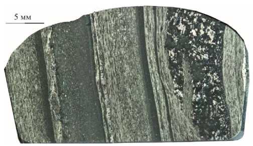 Рис. 2. Пример тонкой слоистой текстуры колчеданных руд Центрально-Вожминского месторождения. Полированный аншлиф, отраженный свет, обр. С39-303,9б. На фото слои с тонкозернистым аутигенным пиритом переслаиваются с пирит-пирротиновыми прослоями