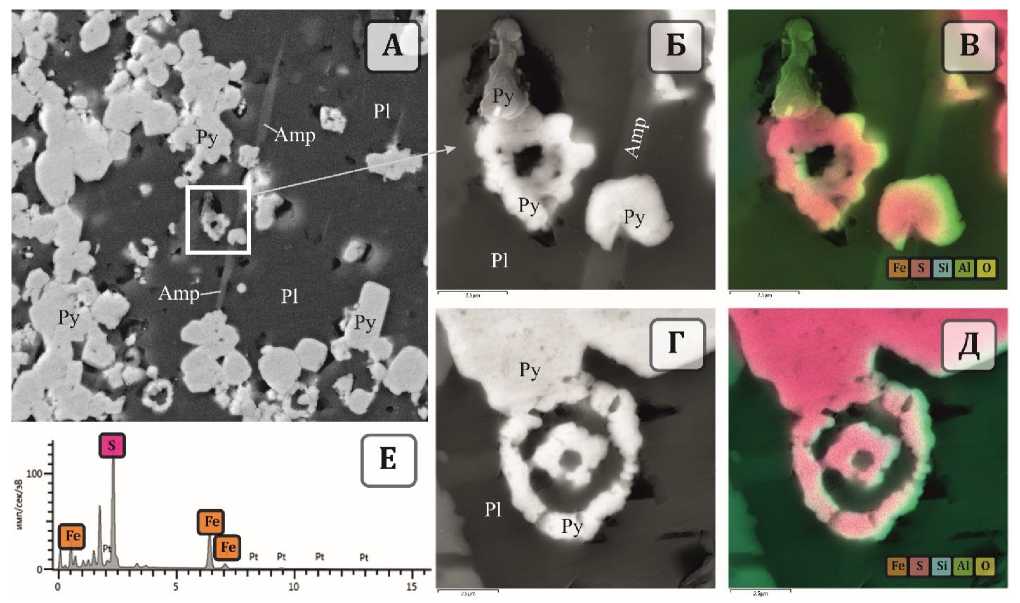 Fig. 3. Diagenetic pyrite in metasedimentary rocks of the Central Vozhma deposit (ЕМ, BSE): A) general view; Б) pipe aggregates of pyrite; В) elemental map of site Б; Г) pyrite framboid; Д) elemental map of site Г; Е) pyrite spectra, Pt film as a coating