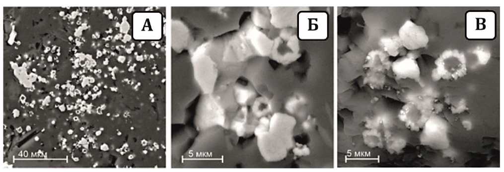 Fig. 5. Biomorphic microstructures preserved in sedimentary rocks of the Vozhma deposit, Karelia: а) multiple tiny rounded and tubular shapes (<10 µm) in the carbonaceous shale; б, в) their zoomed fragments