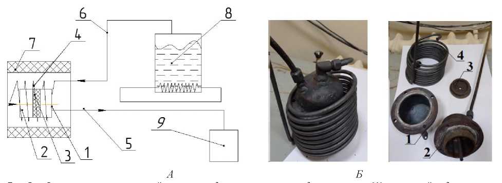 Fig. 2. Scheme of the experimental setup for solid residue activation (A) and the appearance of the activation unit (Б): 1 – middle part of the activation unit; 2 – upper part of the activation node; 3 – perforated cover; 4 – coil; 5 – pipeline for removal of activation gases; 6 – branch pipe for supplying superheated steam; 7 – muffle furnace; 8 – steam generator; 9 – separator
