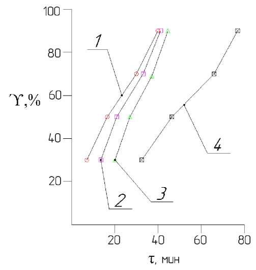 Рис. 4. Зависимость степени выгорания от продолжительности активации при различных плотностях гранул сырья, кг/м3: 1 – 600; 2 – 900; 3 – 1200; 4 – каменный уголь (антрацит) плотностью 1600 кг/м3