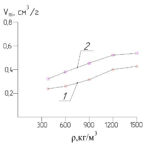 Рис. 6. Зависимость объема микропор активированного угля от плотности исходного гранулированного растительного сырья при степени обгорания: 1 – 50 %; 2 –70 %