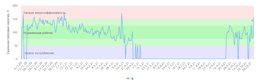 Разработанная система мониторинга и анализа параметров позволяет для каждого здания получить величину отклонения показателя удельного теплопотребления здания от некоторого «оптимального» потребления, что, в свою очередь, помогает при принятии решений по повышению эффективности энергоснабжения потребителей.