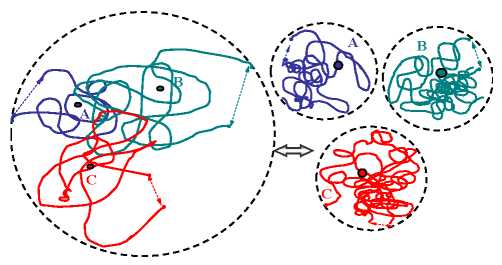 Рис. 2. Схема распада крупного ассоциата при течении раствора на более мелкие кинетически индивидуальные макромолекулярные клубки (VАсс>Vk)