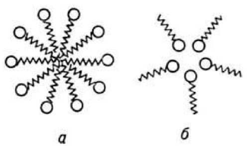 Рис. 3. Мицелла, состоящая из низкомолекулярных молекул дифильного строения, находящихся в полярной (а) и неполярной (б) дисперсионной среде