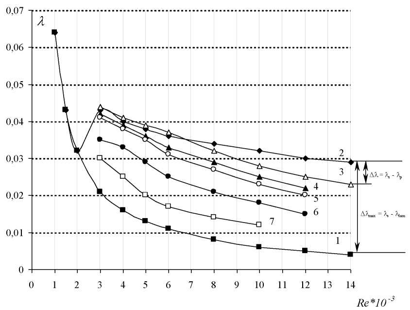 Fig. 4. Dependence of hydrodynamic resistance coefficient on Reynolds number for different systems: 1 – Poiseuille theoretical curve for the laminar flow. lLAM=64/Re(Re·10–3≤ 2300); 2 – Blasius empirical curve for turbulent flow lTUR = 0.3164/Re0.25; 3 – polybutadien solution in gasoline (С=10 g/m3; Mr =2,1×106); 4 – SAS solution (Al-soap) in gasoline (С=1000 g/m3); 5 – polybutadien solution in gasoline (C=20 g/m3; Mr=2,1×106); 6 – SAS solution (Al-soap) in gasoline (C=2000 g/m3); 7 – polybutadien solution in gasoline (C=50 g/m3; Mr=2,1×106)