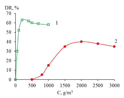 Для сравнительной оценки эффективности различных антитурбулентных добавок можно использовать графическую зависимость величины эффекта от концентрации добавок DR=f(С). Как видно из рис. 5, при увеличении концентрации добавок любой физико-химической природы величина эффекта быстро растет и достигает максимального значения (DRMAX) при некоторой «оптимальной» концентрации (Сoпт.), характерной для каждого образца. При дальнейшем увеличении концентрации добавки эффект уменьшается. Из рис. 5 следует, что для достижения максимальной величины эффекта DR требуется в 10 раз меньше полибутадиена (Сoпт1=200 г/м3), чем нефтерастворимого ПАВ на основе органической соли алюминия (Сoпт2=2000 г/м3). Чем меньше значения «оптимальной» концентрации, тем большую эффективность проявляют антитурбулентные добавки. По этой причине антитурбулентные добавки на основе карбоцепных полимеров (поли-α-олефины, полиизобутилен, полиизопрен, полибутадиен), в отличие от ПАВ, нашли широкое практическое применение в трубопроводном транспорте нефти.