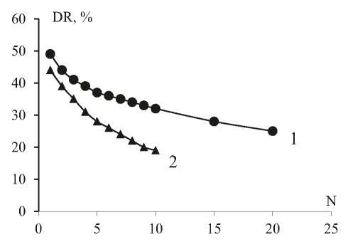 Интерес представляет устойчивость противотурбулентных присадок различной физико-химической природы к деградации. Как видно из рис. 6, построенного после многократного пропускания (N) растворов полибутадиена в бензине (кривая 1) и полигидроксидикарбоксилата алюминия (кривая 2) через цилиндрический канал лабораторного турбореометра при напряжении сдвига τW=60 Па интенсивность потери эффективности координационного полимера заметно выше. Это объясняется тем, что такая сдвиговая нагрузка достаточна для разрушения координационной связи в цепи между молекулами ПАВ (полигидроксидикарбоксилат Al), сопровождающегося её деструкцией на более мелкие фрагменты и уменьшением противотурбулентной эффективности. Меньшая скорость потери противотурбулентной эффективности полибутадиена DR (кривая 1) после каждого очередного прохода полимерного раствора через турбореометр по сравнению с полигидроксидикарбоксилатом объясняется не деструкцией цепи полибутадиена на более мелкие фрагменты, а процессом дорастворения введенного в бензин концентрата и распадом имеющихся надмолекулярных ассоциатов на более мелкие клубки индивидуальных макромолекул (рис. 2).