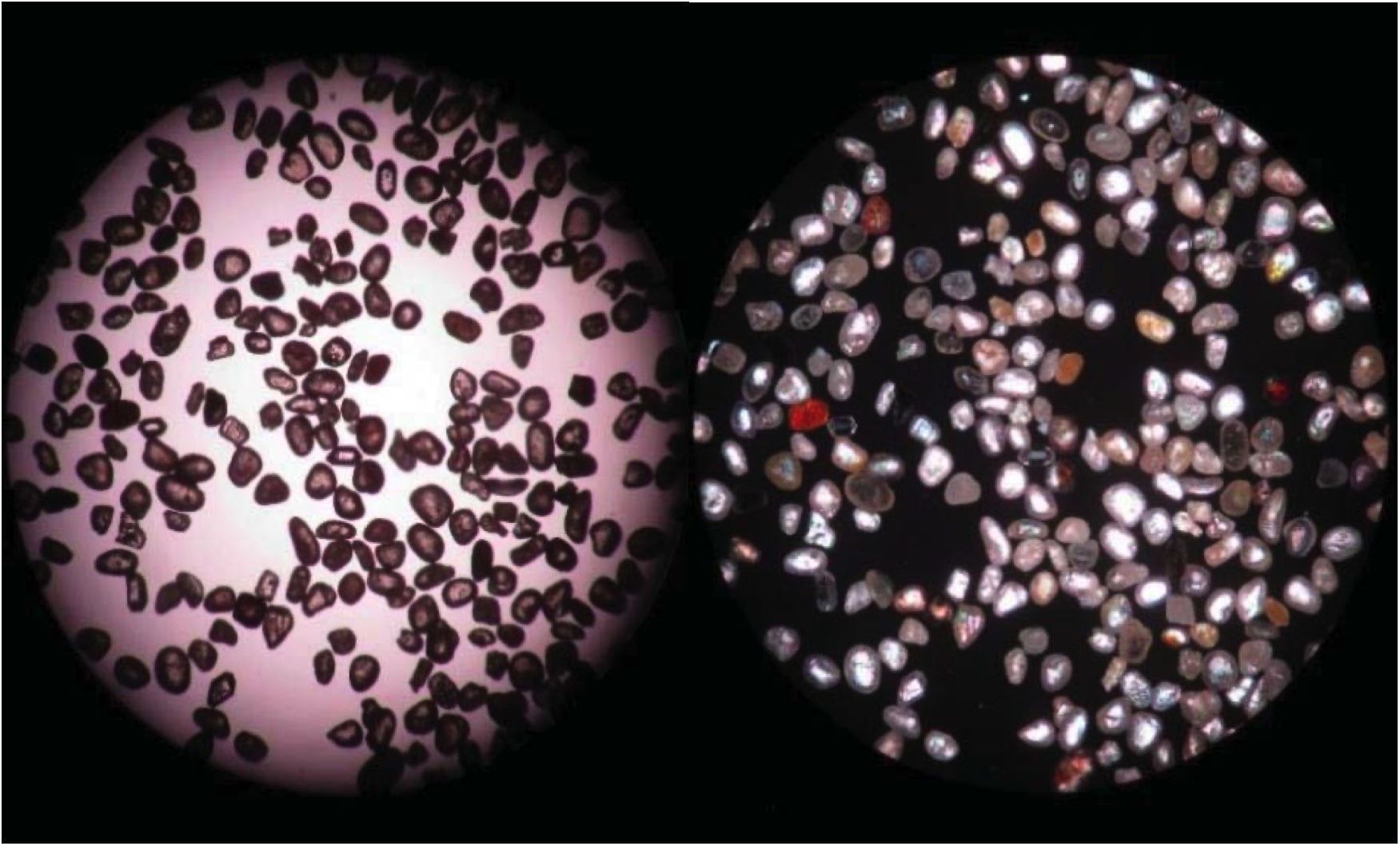 Рис. 2. Изображение монацитового концентрата, полученное методом оптической микроскопии в поляризованном свете с 1 николем (слева) и 2 николями (справа)