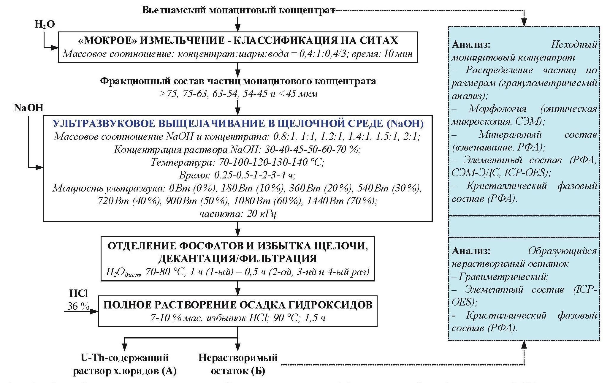 Очищенный от примесей осадок гидроксидов и избыток NaOH растворяли в концентрированной HCl при 90 °С в течение 1,5 час. Cмеси давали отстояться в течение 10 мин и затем фильтровали. Оставшийся нерастворимый остаток промывали 500 мл дистиллированной воды в течение 5 мин при комнатной температуре. Для обеспечения полноты удаления нерастворимых в HCl РЗЭ и других примесей промывку повторяли три раза. Определяли массу нерастворимого остатка, а методами РФА и ИСП-ОЭС анализировали его элементный состав. Кристаллическую структуру определяли методом РФА. В полученном растворе ИСП-ОЭС методом определяли концентрации U, Th, РЗЭ и других эементов. Схема исследований представлена на рис. 4.