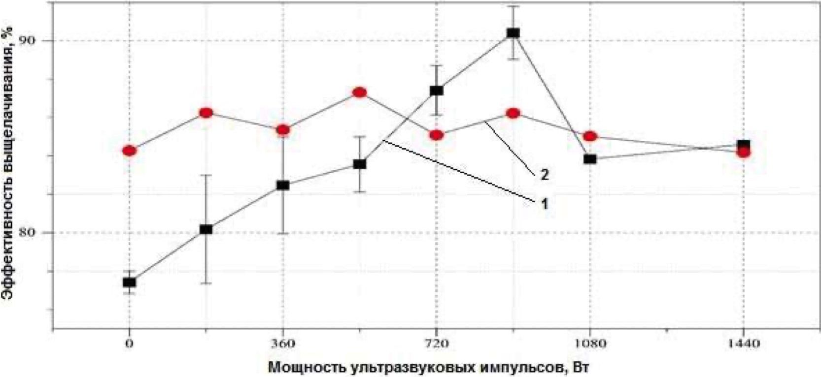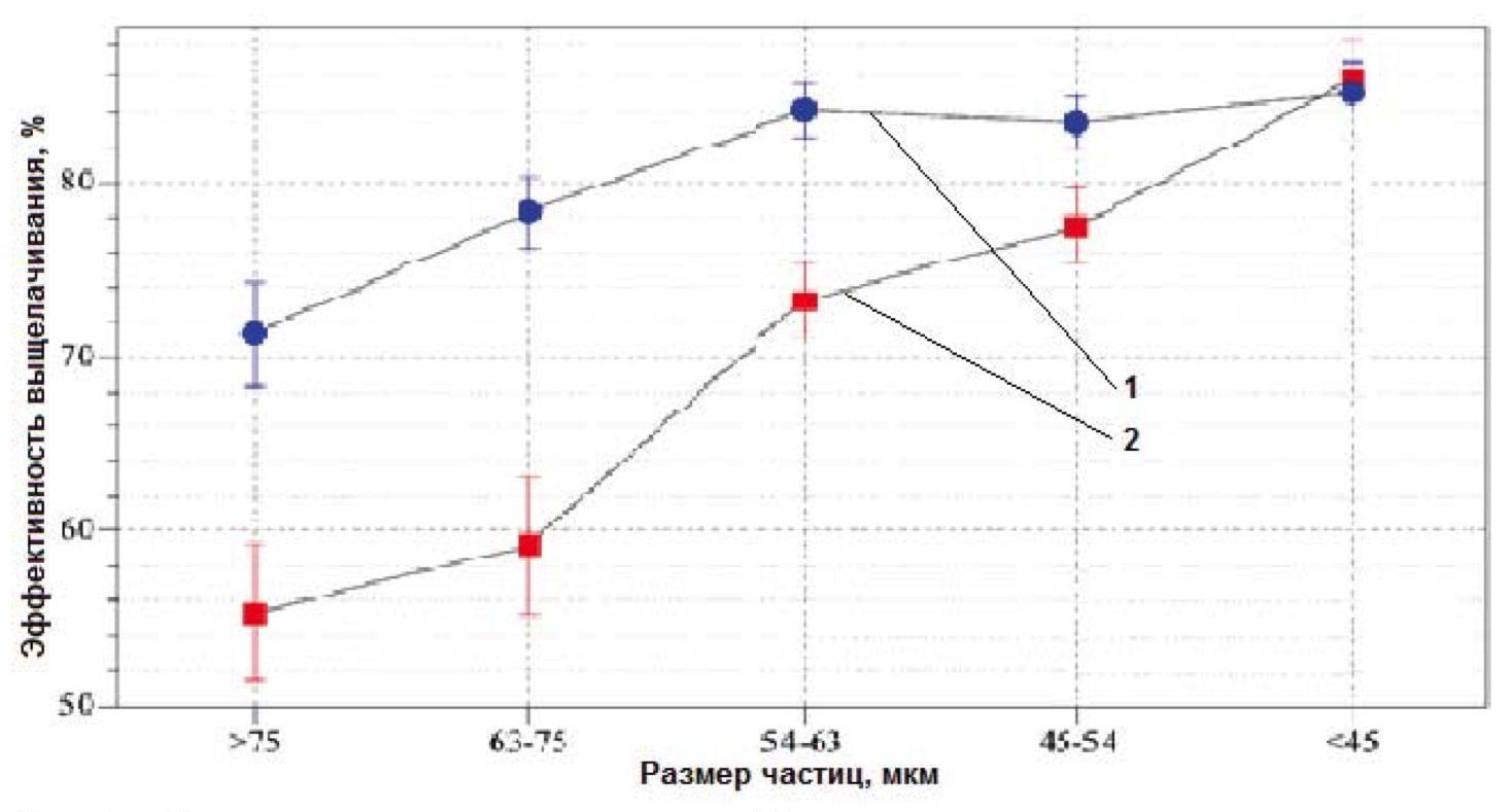 Рис. 5. Влияние размера частиц на эффективность выщелачивания при ультразвуковом воздействии и при интенсивном перемешивании: 1 – выщелачивание с использованием ультразвуковых импульсов; 2 – выщелачивание при перемешивании