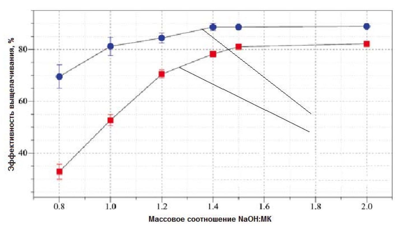 - использовать оптимальное массовое соотношение 50 %-ного раствора NaOH к концентрату, равное 1,4:1, при температуре 140 °С;