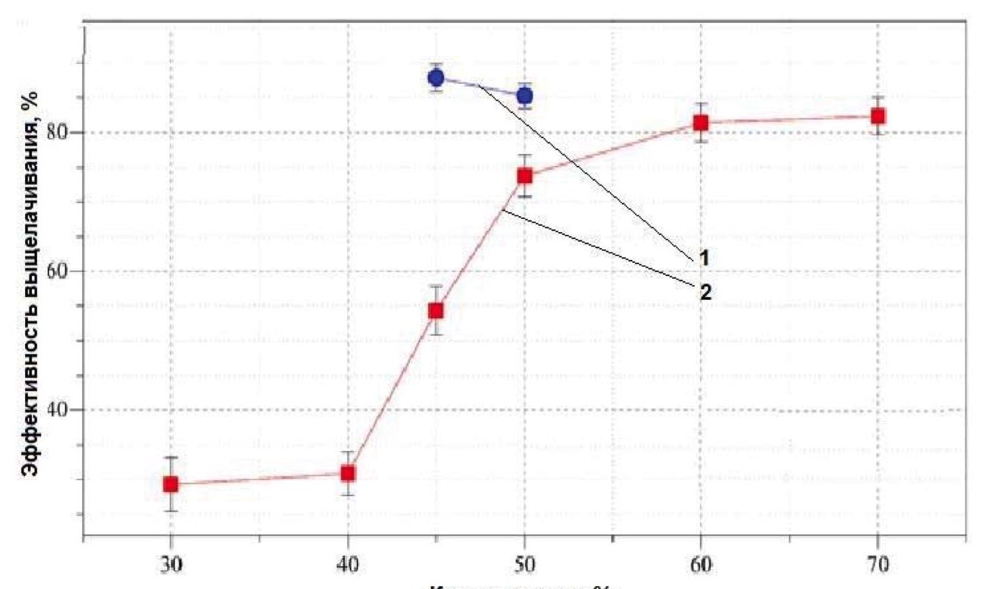 Рис. 7. Влияние концентрации NaOH на эффективность выщелачивания при перемешивании и ультразвуковом воздействии: 1 – выщелачивание с использованием ультразвуковых импульсов; 2 – выщелачивание при перемешивании