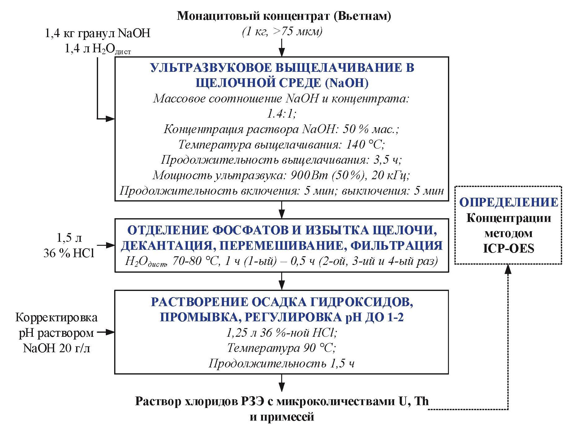 Methods. Fusion with NaOH under pressure and fusion with NaOH combined with ball milling, as well as fusion with NaOH using high intensity ultrasound. High-intensity ultrasound has long been studied and used in industry to intensify leaching/alloying in various applications to increase efficiency and speed in leaching for copper, vanadium, nickel, bauxite and uranium ores. This article is devoted to studying the influence of high-intensity ultrasound on the efficiency of opening monazite concentrate with NaOH solutions. Experimental data were obtained using mass spectrometric, X-ray diffraction and ICP-OES analysis methods.
