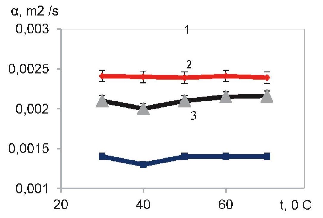 Fig. 1. Dependence of the thermal diffusivity coefficient on temperature: carbon black grade: 1 – P-366E; 2 – P‑234; 3 – P-514