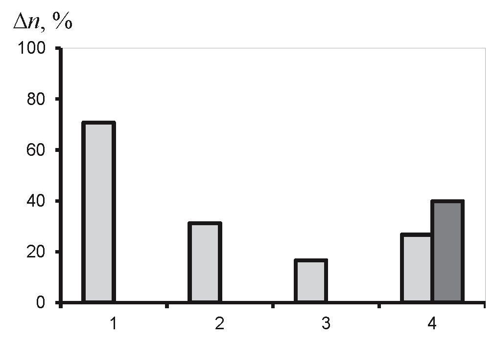 Характер взаимодействия электропроводящего компонента с эластомером оценен по коэффициенту нелинейности, который рассчитывался по вольтамперной характеристике материалов с использованием методики, описанной в [1]. Процент изменения коэффициента нелинейности (отношение разности коэффициентов нелинейности материалов с техническим углеродом П 514 и П 366Э к значению при П 514) представлен на рис. 4. Согласно проведенным в [11] исследованиям, он связан с количеством полимерных прослоек между частицами технического углерода. Увеличение количества прослоек связующего материала при использовании технического углерода П-514 существенно снижает теплопроводность материала, на что указывает уменьшение коэффициента нелинейности. Это соответствует теоретическим представлениям, описанным в [21].