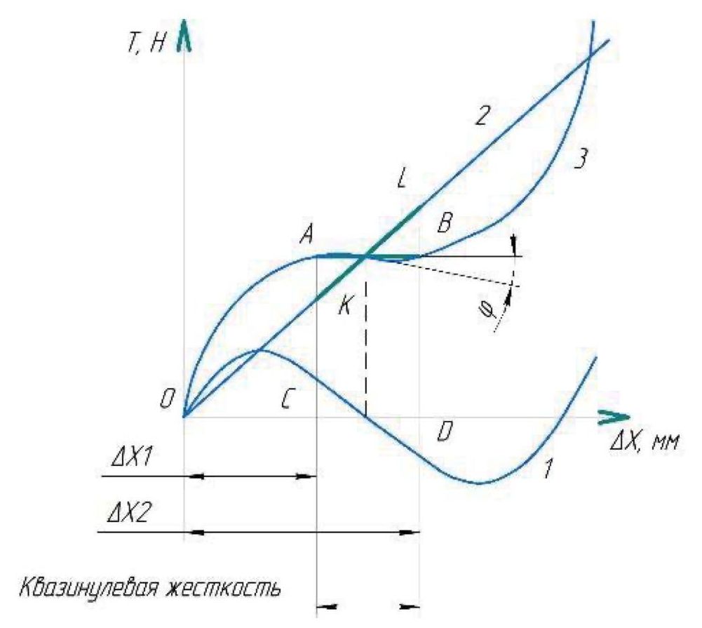 Рассмотрим участок АВ, лежащий на квазинулевой силовой характеристике 3, который характеризуется постоянной величиной вертикальной силы, воздействующей на систему. При этом коэффициент жесткости на участке АВ будет стремиться к нулю. Участок AB – участок, имеющий квазинулевую жесткость, наличие которой обусловлено результатом сложения жесткостей на участках KL и CD, соответственно, линейной и нелинейной.