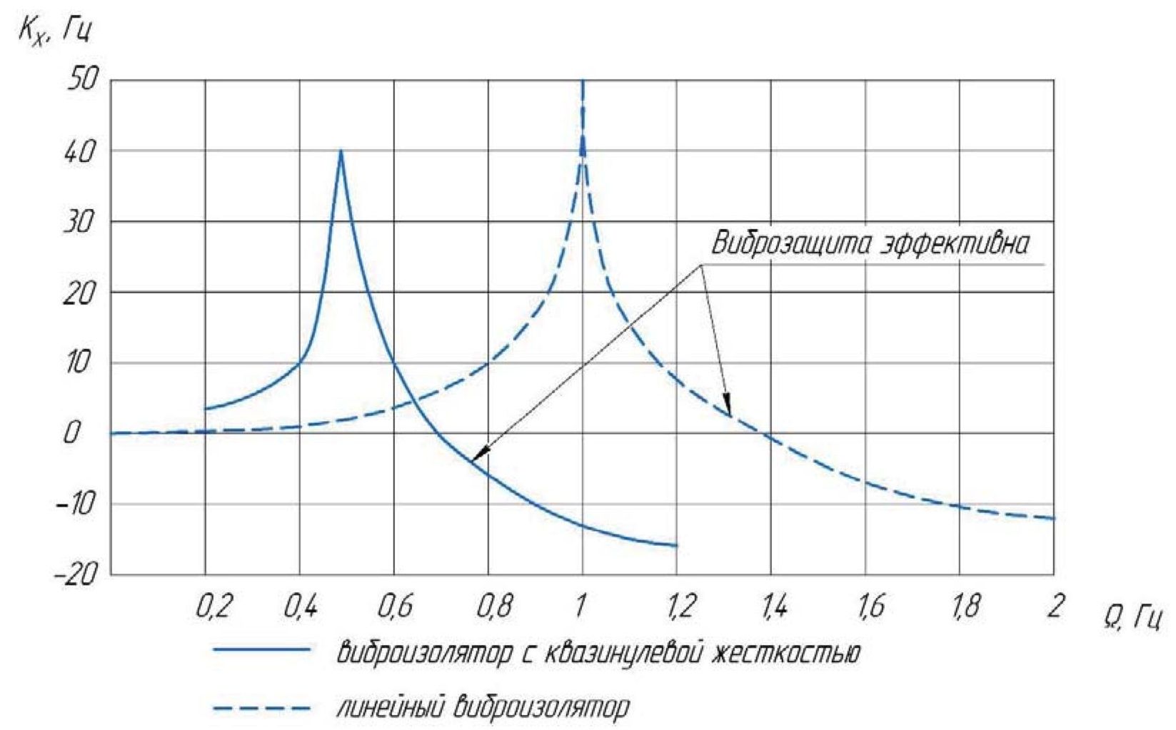 Защита от вибрации будет эффективна при значении коэффициента Kx<0 dB, таким образом частотный диапазон эффективной работы виброзащитной системы с квазинулевой жесткостью больше, чем у системы с линейной жесткостной характеристикой – сплошная характеристика раньше прерывистой переходит в отрицательную зону.