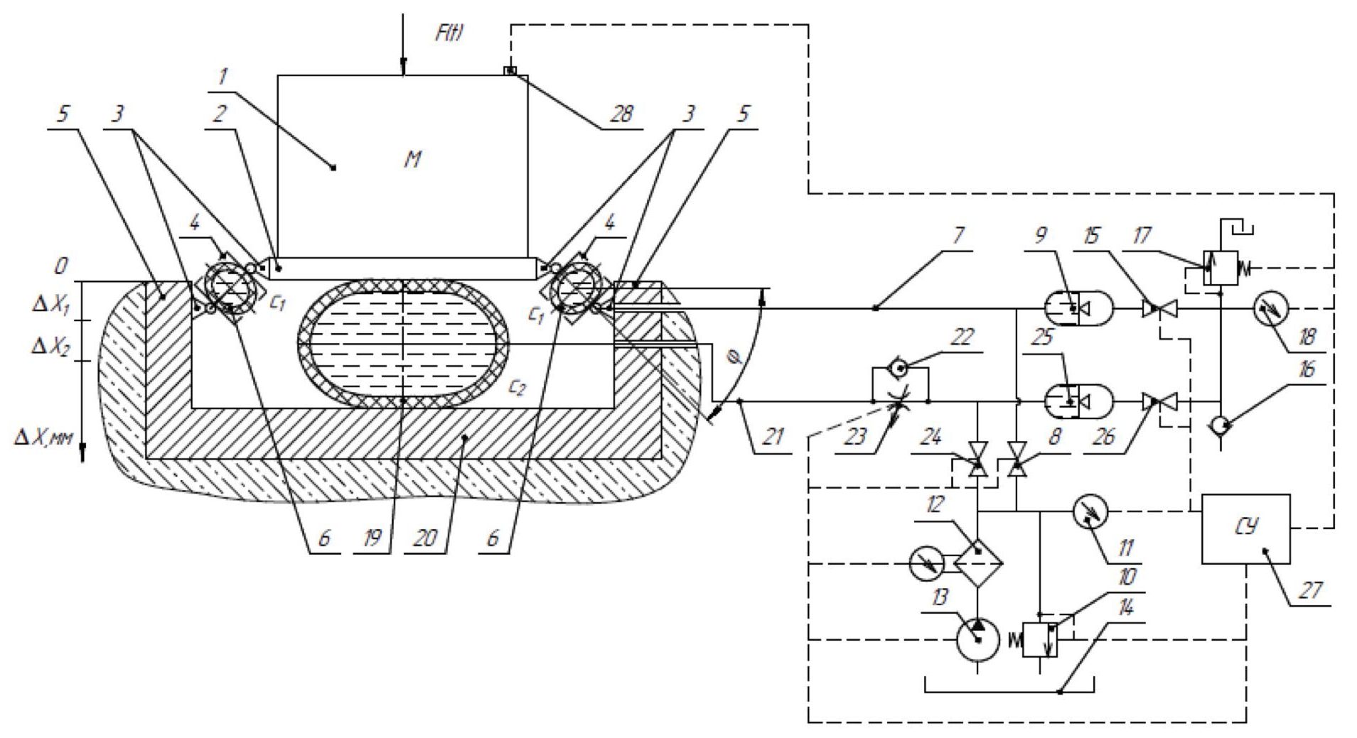 Система управления – 27 формирует требуемый алгоритм функционирования вентилей – 8, 15, 24, 26, насоса – 13, предохранительных клапанов – 10, 17, дросселя – 23 и акселерометра – 28.