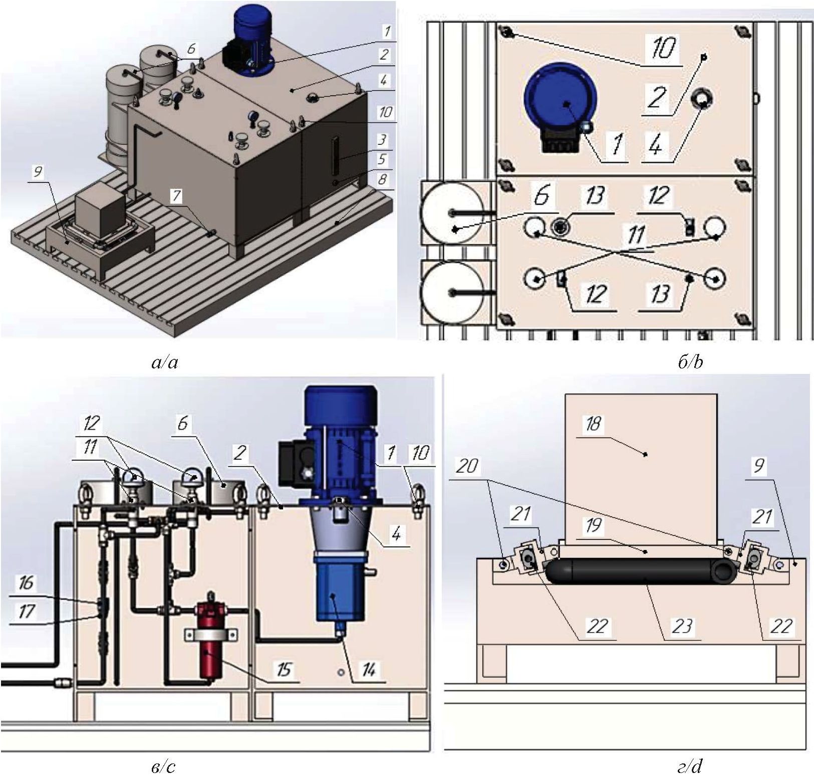 Рис. 8. 3D-модель устройства: а) общий вид виброзащитной системы с квазинулевой жесткостью; б) вид сверху на систему управления; в) вид изнутри системы управления; г) вид виброгасителя с квазинулевой жесткостью в разрезе; 1 – электрический двигатель; 2 – корпус гидравлической насосной станции; 3 – маслоуказатель; 4 – пробка масляной заливной горловины; 5 – пробка сливная; 6 – гидропневмоаккумулятор; 7 – обратный клапан; 8 – основание; 9 – корпус виброгасителя; 10 – рым болты; 11 – вентиль; 12 – манометр; 13 – предохранительный клапан; 14 – аксиально-поршневой насос; 15 – фильтр; 16 – дроссель; 17 – обратный клапан; 18 – промежуточная масса; 19 – полка; 20 – шарниры; 21 – стаканы; 22, 23 – шланги