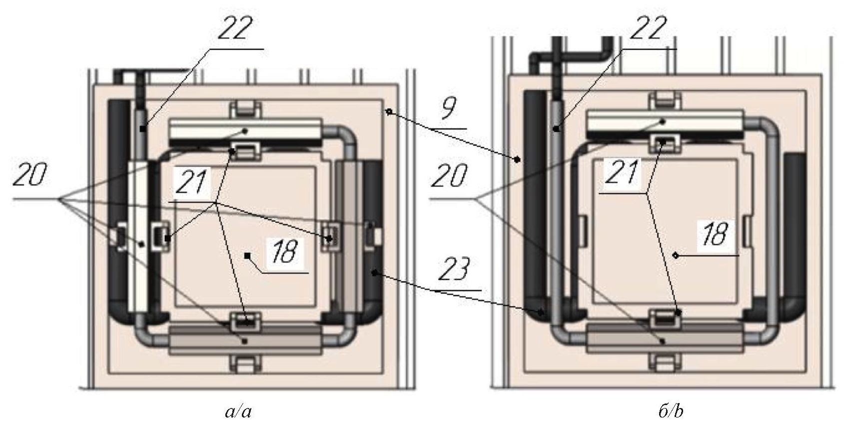 На рис. 9 представлены соединения шарниров – 20 со стаканами – 21. В первом варианте (рис. 9, а) установлено четыре соединения шарниров – 20 со стаканами – 21, во втором – два соединения шарниров – 20 со стаканами – 21 (рис. 9, б). Выбор варианта конструктивного исполнения зависит от требуемых направлений демпфирования вибраций: