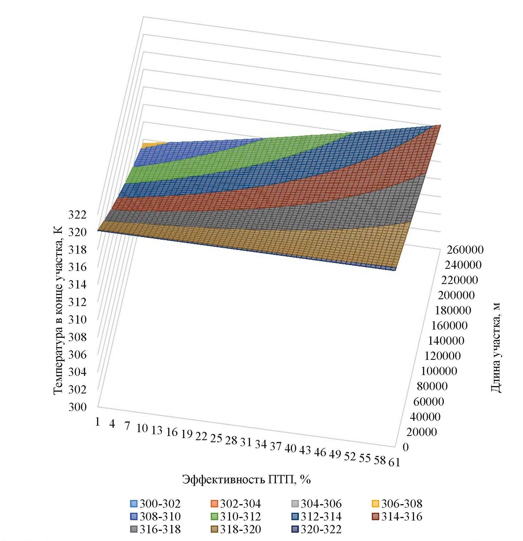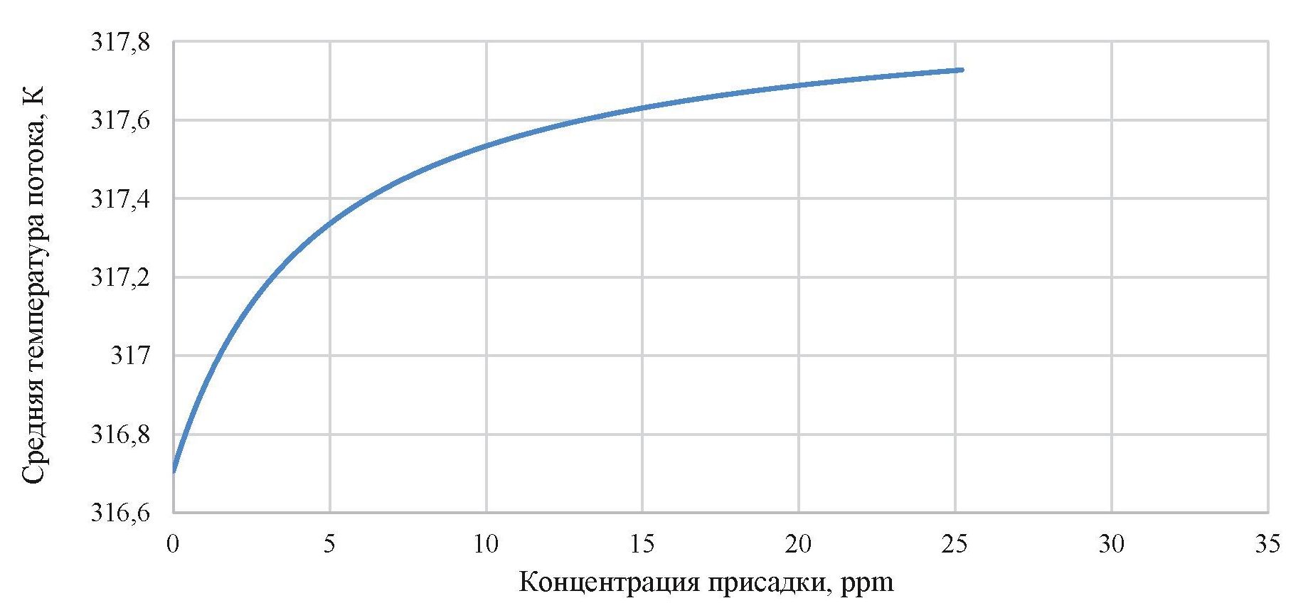 С добавлением полимерного агента область более высоких температур расширяется (то есть на одинаковом расстоянии от начала участка с увеличением концентрации присадки наблюдается более высокая температура, чем при нулевой концентрации присадки) и интенсивность уменьшения температуры с длиной падает. Теоретически представляется возможным увеличивать тепловую эффективность ПТП, используя присадки, обладающие наибольшим предельным значением эффективности. Актуализируется применение высокоэффективных присадок, эффективность которых, согласно данным авторов, может достигать значений до 80 %, что делает применение ПТП в качестве способа уменьшения тепловых потерь перспективным направлением в развитии отрасли трубопроводного транспорта.
