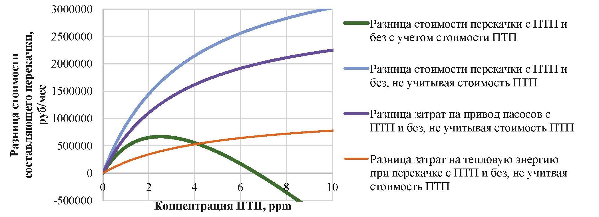 Выгода от применения ПТП увеличивается с ростом ее концентрации. Наибольшая выгода от применения ПТП с учетом ее стоимости составляет ≈666594 р./мес и наблюдается при концентрации ПТП около 2,6 ppm. В расчете не учитывалась деструкция полимера. При более высоких концентрациях ПТП затраты на саму присадку превалируют над эффектом экономии затрат на электроэнергию и на нагрев продукта, а при концентрации ≈6,8 ppm (эффективность 33 %) применение ПТП становится невыгодным.