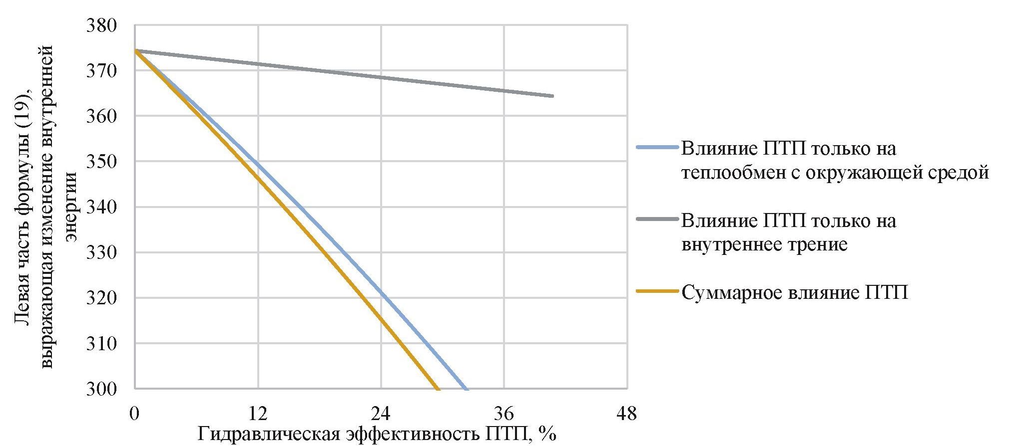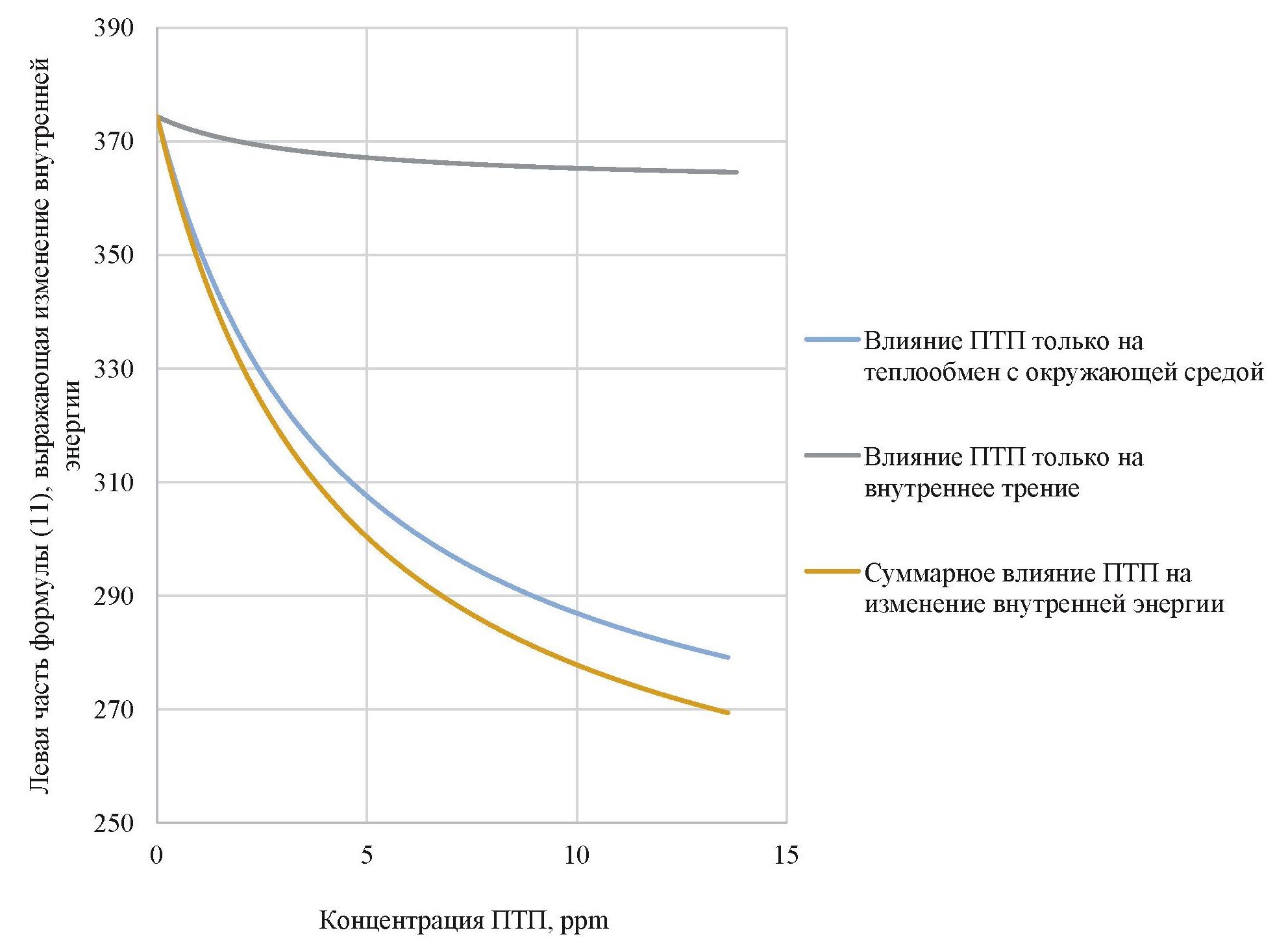 В результате того, что скорость роста гидравлической эффективности ПТП уменьшается при возрастании концентрации ПТП, наибольшее изменение внутренней энергии в части снижения тепловых потерь наблюдается при малых концентрациях ПТП, однако сами тепловые потери сокращаются с продолжением ввода ПТП, но менее интенсивно.