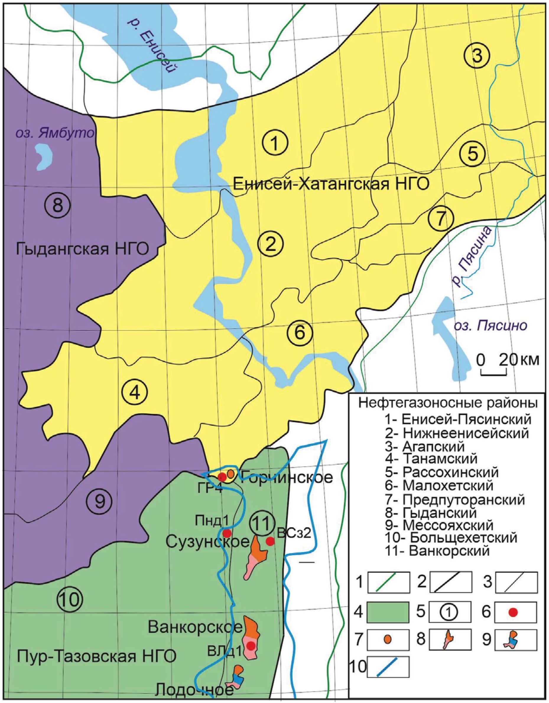 Fig. 1. Diagram of oil and gas geological zoning of the studied territory [5–7]: 1 – boundaries of prospective lands; 2 – boundaries of the oil and gas-bearing region (OGR); 3 – boundaries of the oil and gas-bearing district (OGD); 4 – OGR color; 5 – OGD numbers; 6 – wells studied: GR4 – Gorchinskaya 4, VSz2 – Vostochno Suzunskaya 2, Pnd1 – Pendomayakhskaya 1 and VLd1 – Vostochno Lodochnaya 1, 7–9 – hydrocarbon fields: gas (7), gas-oil (8) and condensate gas-oil (9); 10 – boundary of the Bolshekhetskaya structural terrace