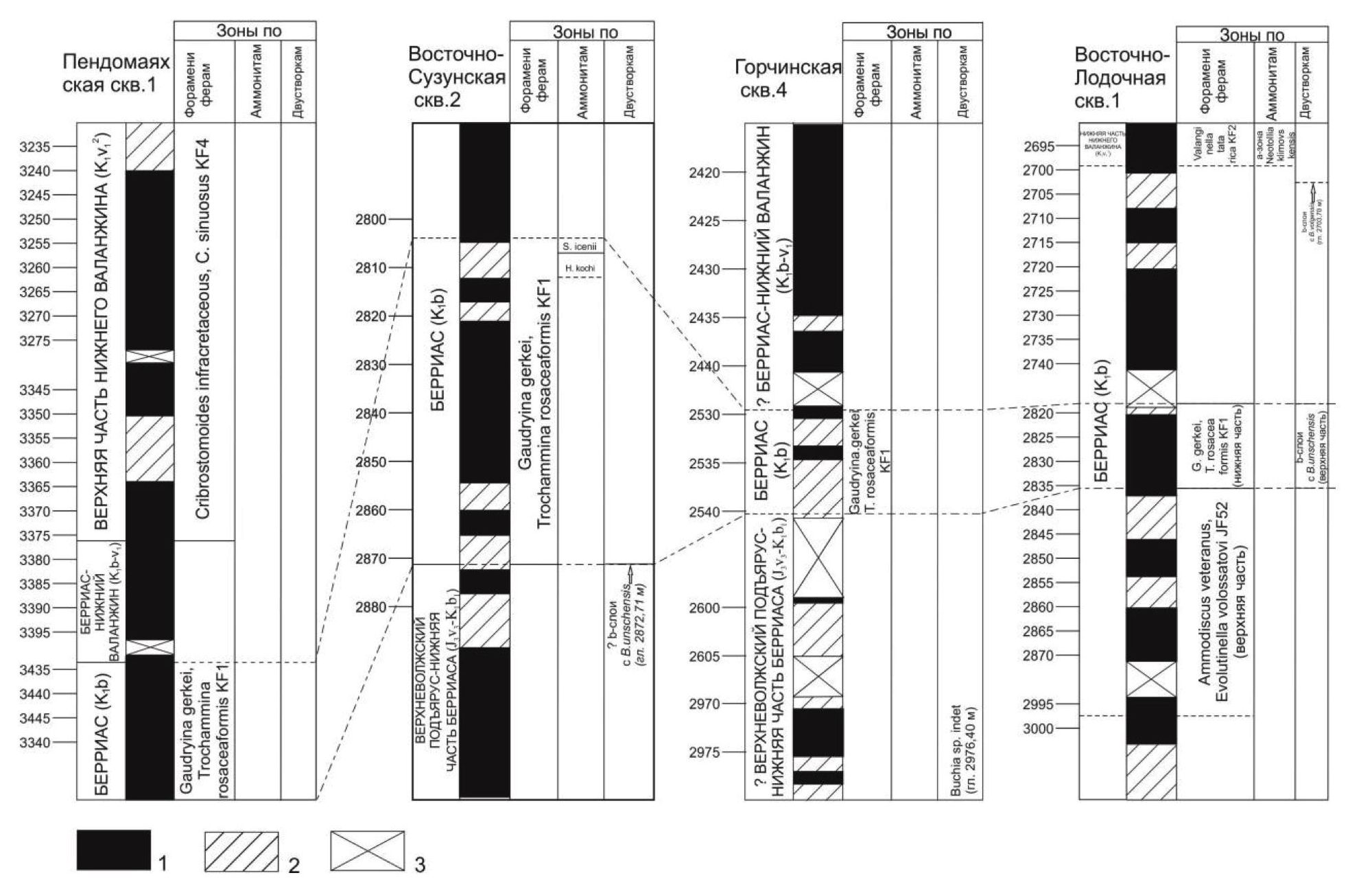 Большехетская структурная терраса занимает удачное положение на северо-востоке Западносибирской НГП (рис. 1), которое позволяет проводить удаленные корреляции и на приарктические территории, и в центральные части НГП, вмещает уникальное по запасам УВ Ванкорское месторождение. Выбраны скважины Пендомаяхская 1, Восточно-Сузунская 2, Горчинская 4 и Восточно-Лодочная 1, вскрывшие исследуемый верхнеюрский-нижнемеловой интервал разреза, хорошо палеонтологически охарактеризованный.