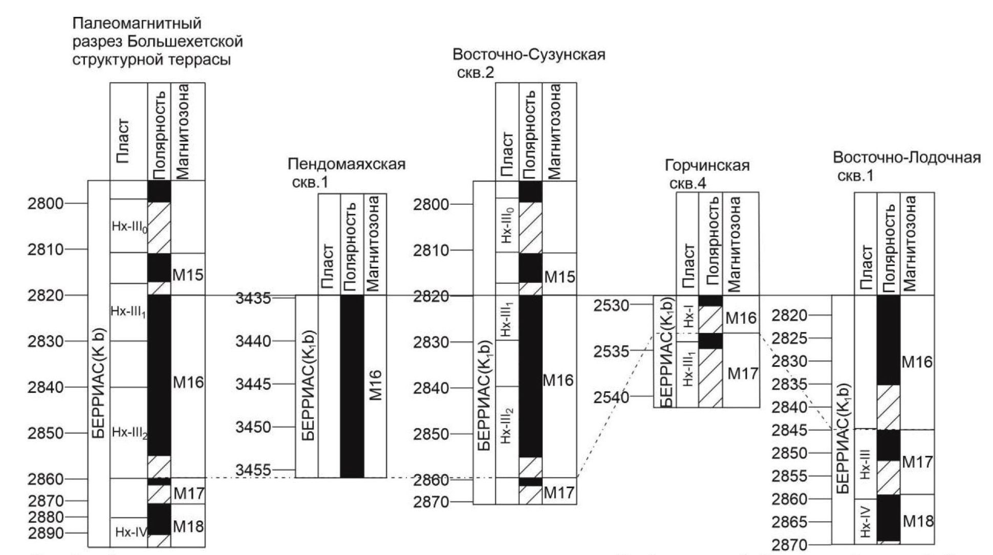 Различный вклад магнитостратиграфической информации исследованных скважин в сводный разрез можно объяснить структурным положением этих скважин. Наиболее объемная информация содержится в скважинах Восточно-Лодочная 1 и, особенно, в Восточно-Сузунской 2, локализованных соответственно в Лодочном и Сузунском валообразных поднятиях, осложняющих структуру Большехетской террасы. Отсутствие в разрезе Восточно-Сузунской скважины 2 отложений Нх-IV восполняется их наличием в разрезе скважины Восточно-Лодочная 1. Сокращение объема и «разорванность» информации в Восточно-Лодочной 1 скважине обусловлено влиянием Ванкорской структуры, в скважинах Пендомаяхская 1 и Горчинская 4 – смещением разрезов в западном направлении и возможным влиянием Мессояхской гряды (в случае Горчинской 1).