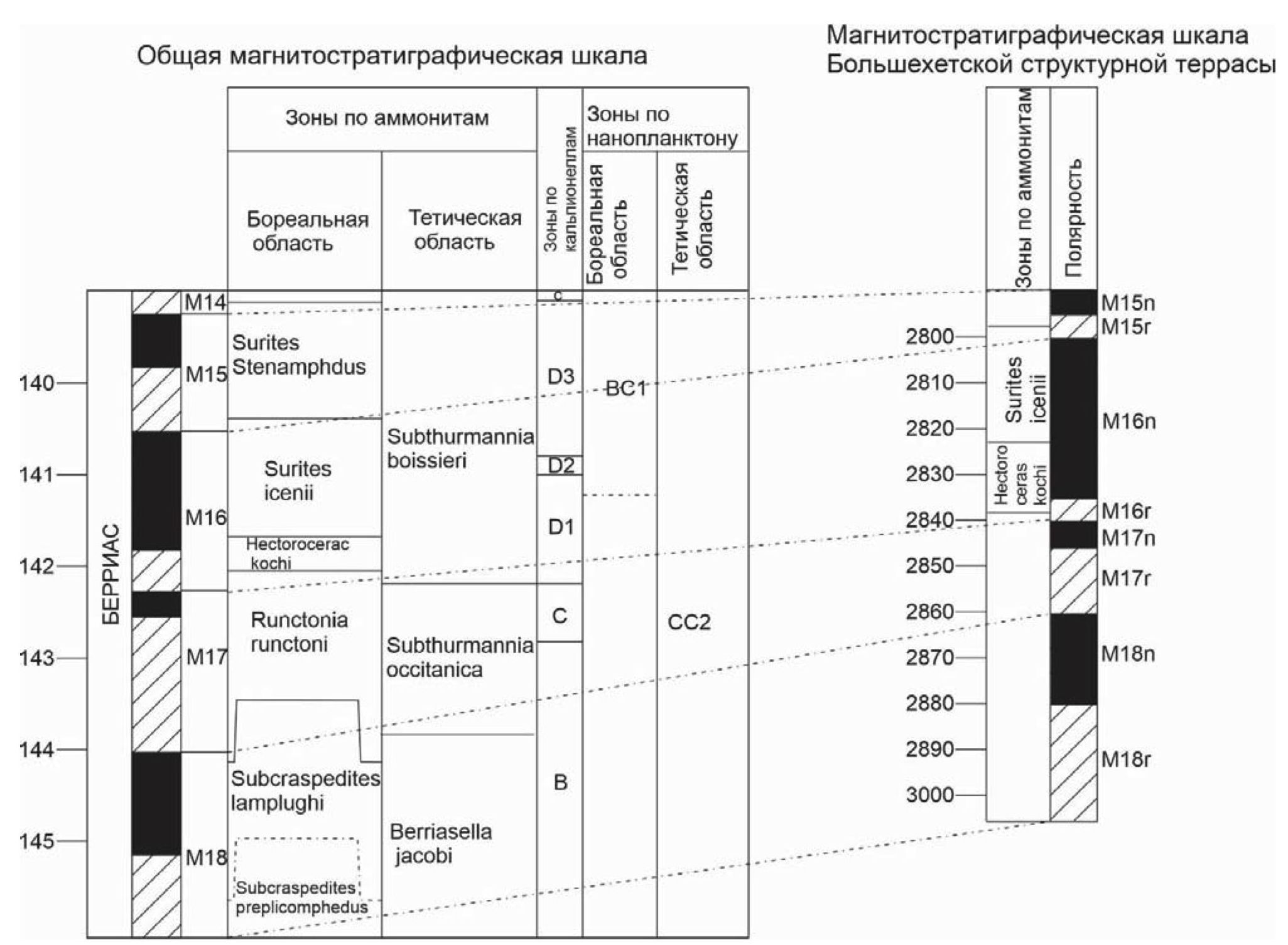 На основании сопоставления биостратиграфических и палеомагнитных материалов, а также с учетом данных геофизических исследований скважин [34] и опубликованной информации [35] был составлен сводный магнитостратиграфический разрез пограничных юрско-меловых отложений Большехетской структурной террасы (рис. 3, 4) и сопоставлен с общей мировой магнитостратиграфической шкалой (рис. 5) [36].