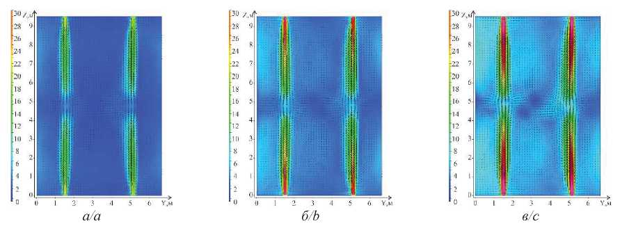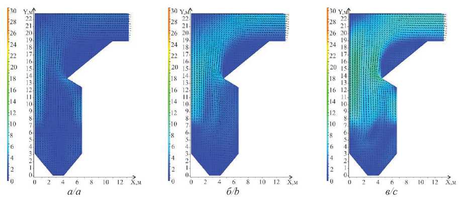 Рис. 2. Распределение скоростей (м/с) в продольном сечении топочной камеры: а) нагрузка 50 %; б) нагрузка 80 %; в) нагрузка 100 %